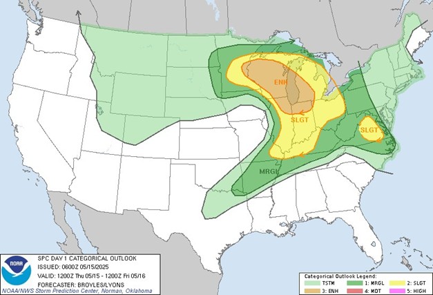 Severe weather is expected across a large swath of real estate from the Southern Plains to the Great Lakes on Wednesday. Image provided by the Storm Prediction Center.