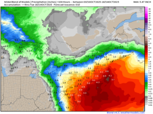 Hilary is expected to continue weakening today as it passes very close to the Baja coastline and into southern California. Hilary will produce gusty winds and storm surge along the coast, with a few tornadoes possible across parts of the Southwest, but heavy rain and the resultant flooding are the most significant threat with this storm. Rainfall totals of 3-6 inches are likely across many locations in southern California and Nevada, with some totals in excess of 10 inches possible. In some of the desert locations, including Death Valley, this is more rain than they normally receive in an entire year. Widespread flooding is likely, including the San Diego, Los Angeles, and Las Vegas metropolitan areas. As Hilary continues to push northward and weakens, heavy rain will spread across the Great Basin, and Inland Northwest, with rainfall totals of 1-3 inches possible, likely producing some flooding in these areas as well.