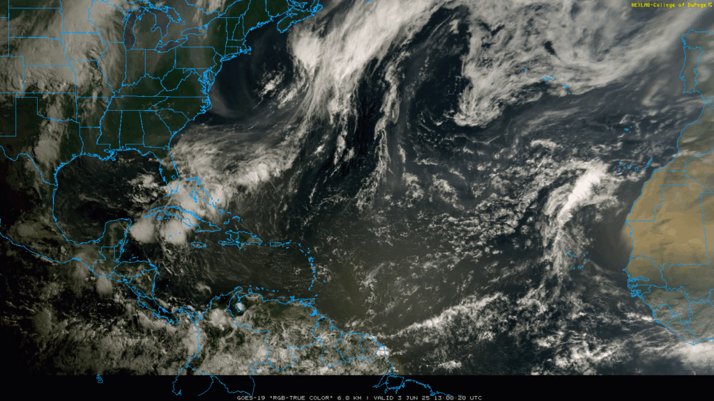Satellite loop showing a plume of Saharan dust crossing the Atlantic and Caribbean. Loop provided by NOAA.