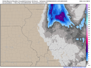 Several inches of snow are expected to fall in Northwest Indiana, along the coast of Lake Michigan, due to a Lake Effect snow event. Image provided by Weather Models.