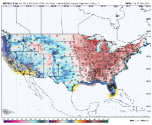 The cold air will allow for record-breaking temperatures across the Southeast on Tuesday morning. Image provided by Weatherbell.