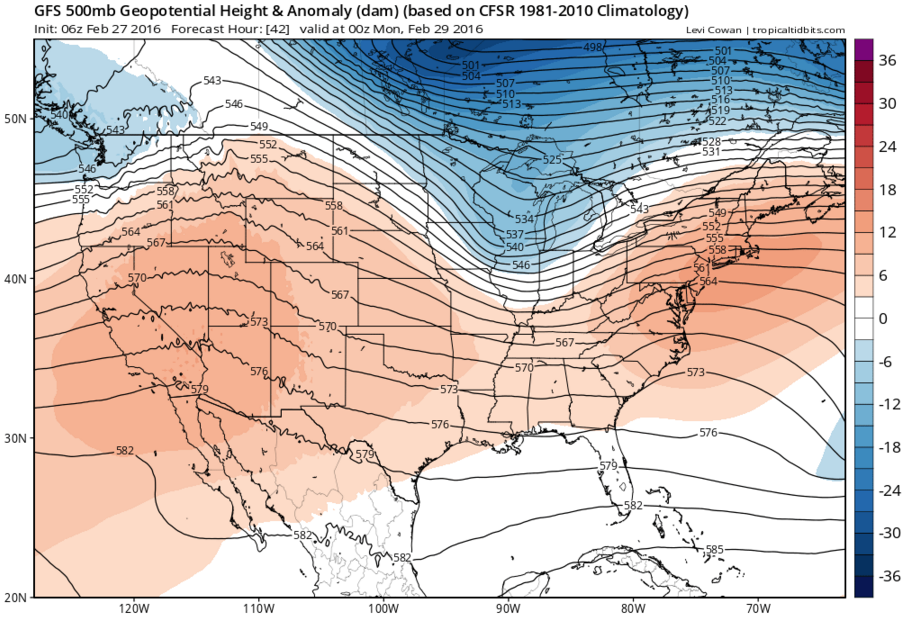 Above normal heights in the west and east indicating warm air is nearby.